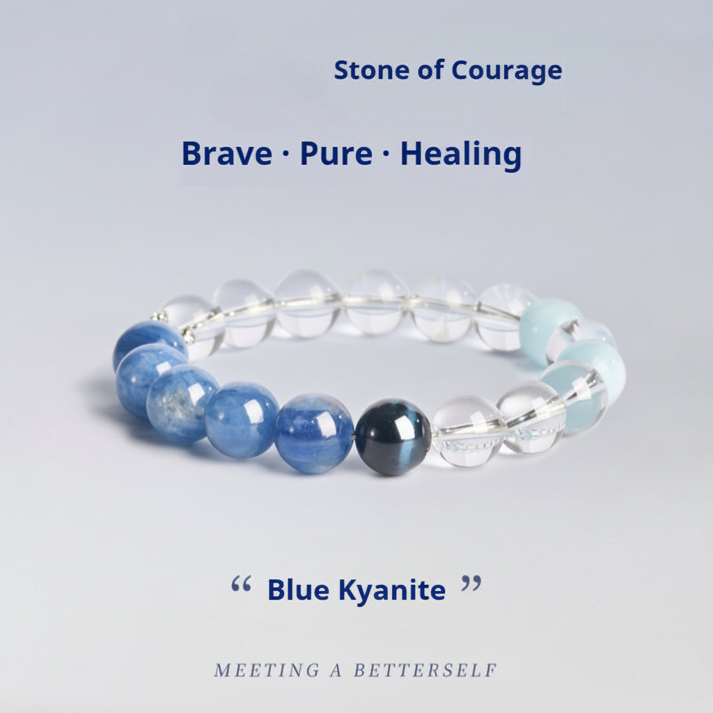Blue Kyanite (The Stone of Courage): Known for its unique fibrous structure and high-vibration blue frequency, Kyanite is one of the few stones that does not accumulate negative energy. It promotes a "pure" state of being, allowing you to speak your truth and move forward without fear.