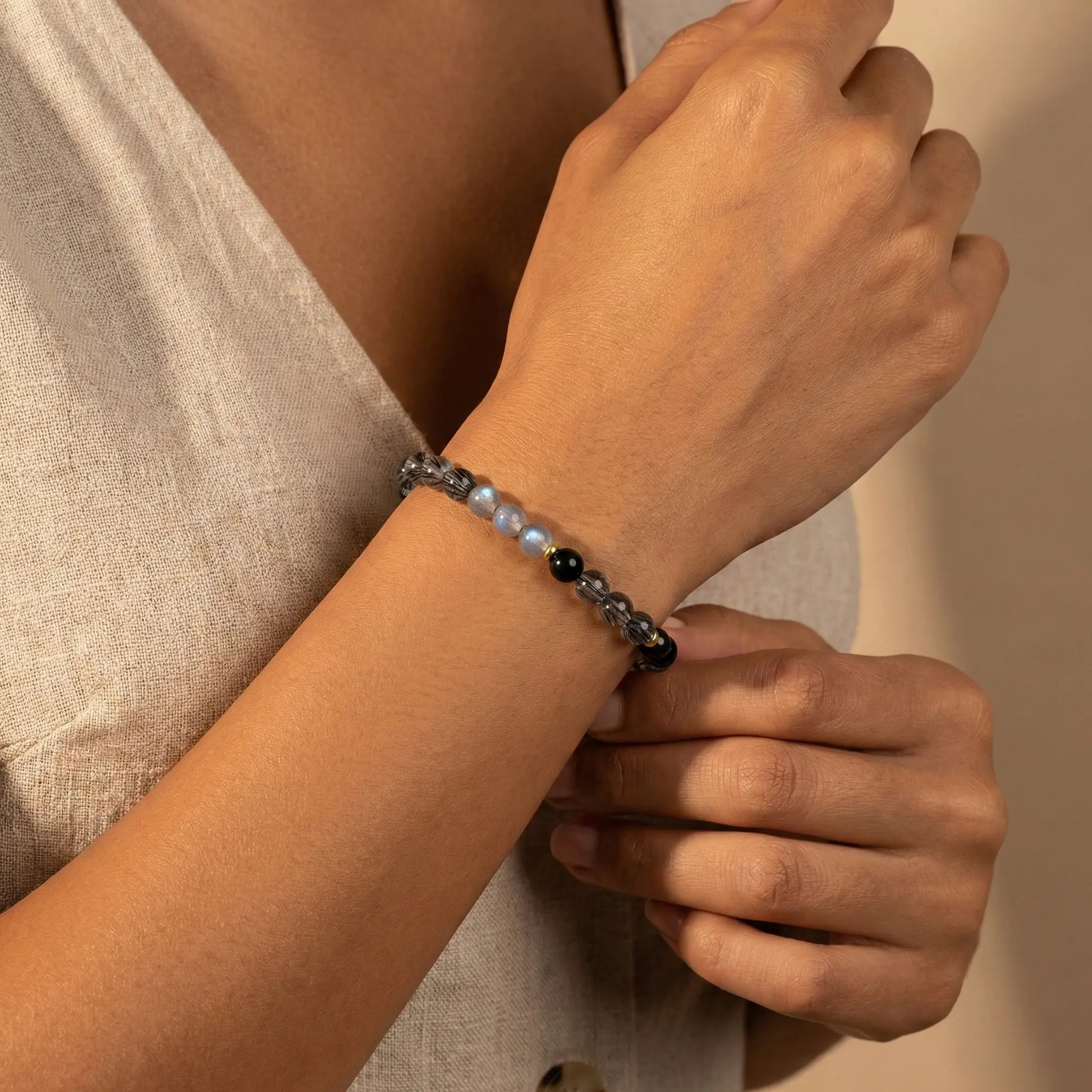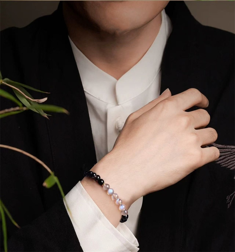Iridescent Moonstone: These glowing blue-white beads serve as a "Lighthouse" for the intuition. In the InnerFate philosophy, Moonstone softens the intensity of the black stones, fostering a state of Anxiety Relief & Calm.