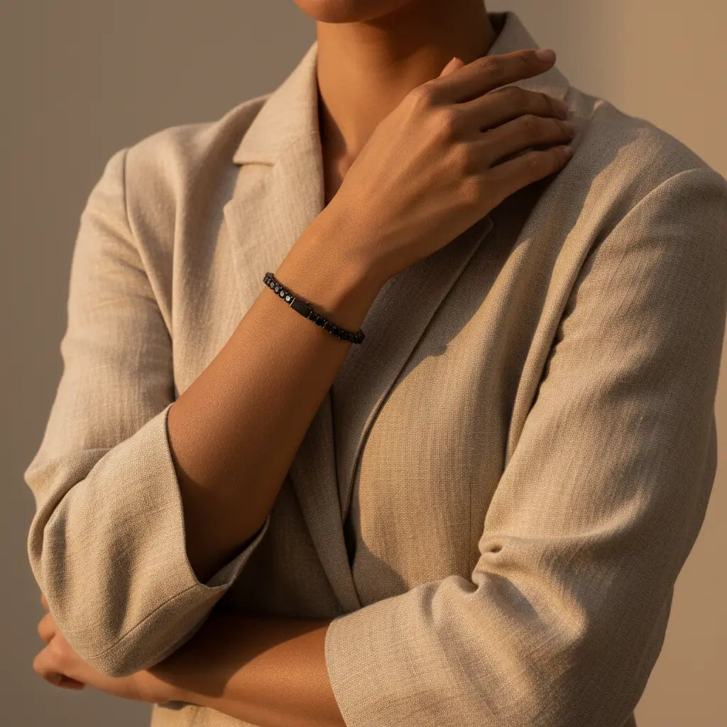 Deep Grounding Frequency: The midnight black stones resonate with the Root Chakra, helping to turn "anxious energy" into a calm, professional presence for Success in the boardroom.